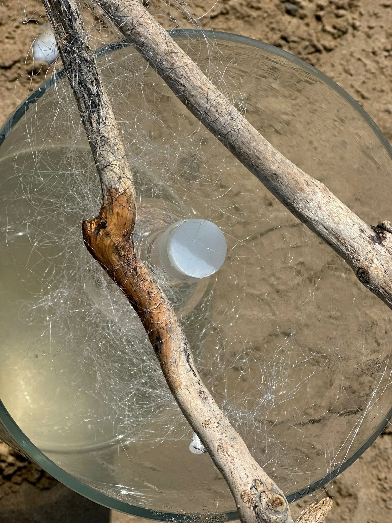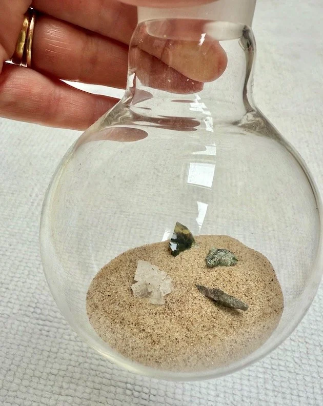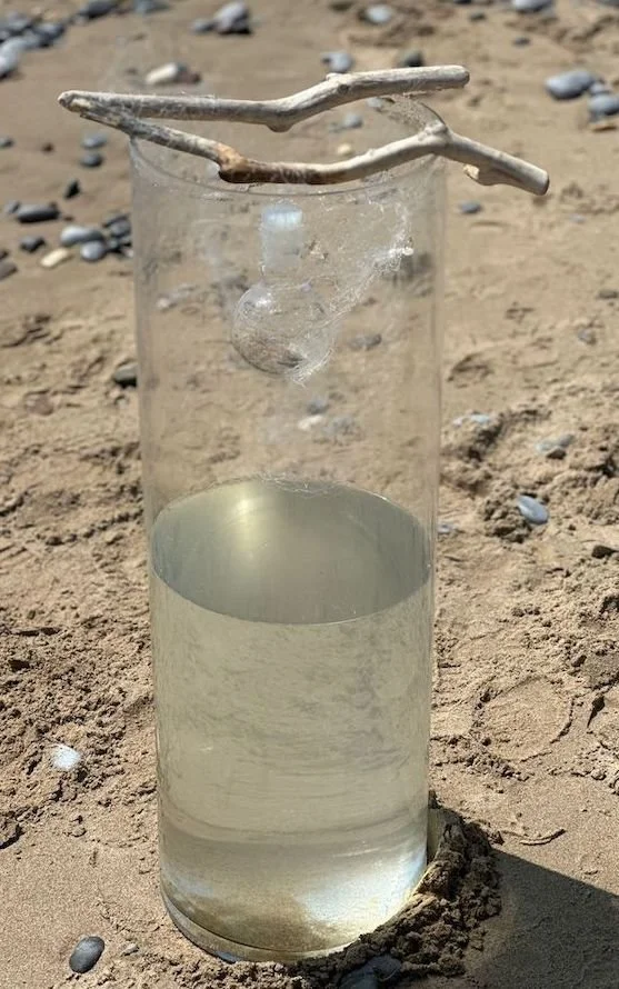 Materials: Large glass tube, synthetic fishing net, driftwood, sea water, a glass lab flask containing sand and fragments of: sand-glass, granite, faience paste and antarctic basalt.